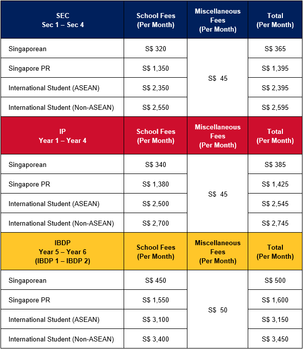 School fees with effect from 1 January 2026 are tabulated below. Admission to our school is merit-based and no Singaporean admitted to ACS (Independent) will be turned away because he / she cannot afford school fees. Singapore citizens may seek information on the various financial assistance programmes from our Deputy Principal, Mr Patrick Soo (patrick@acsindep.edu.sg).