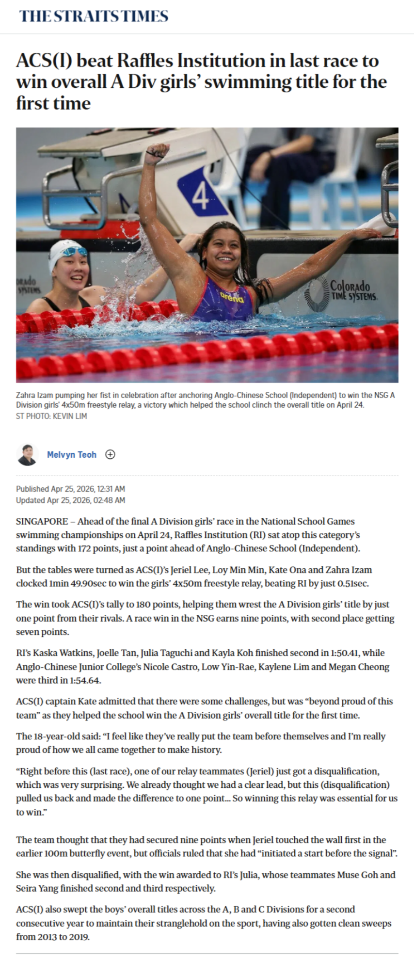 ACS(I) beat Raffles Institution in last race to win overall A Div girls' swimming title