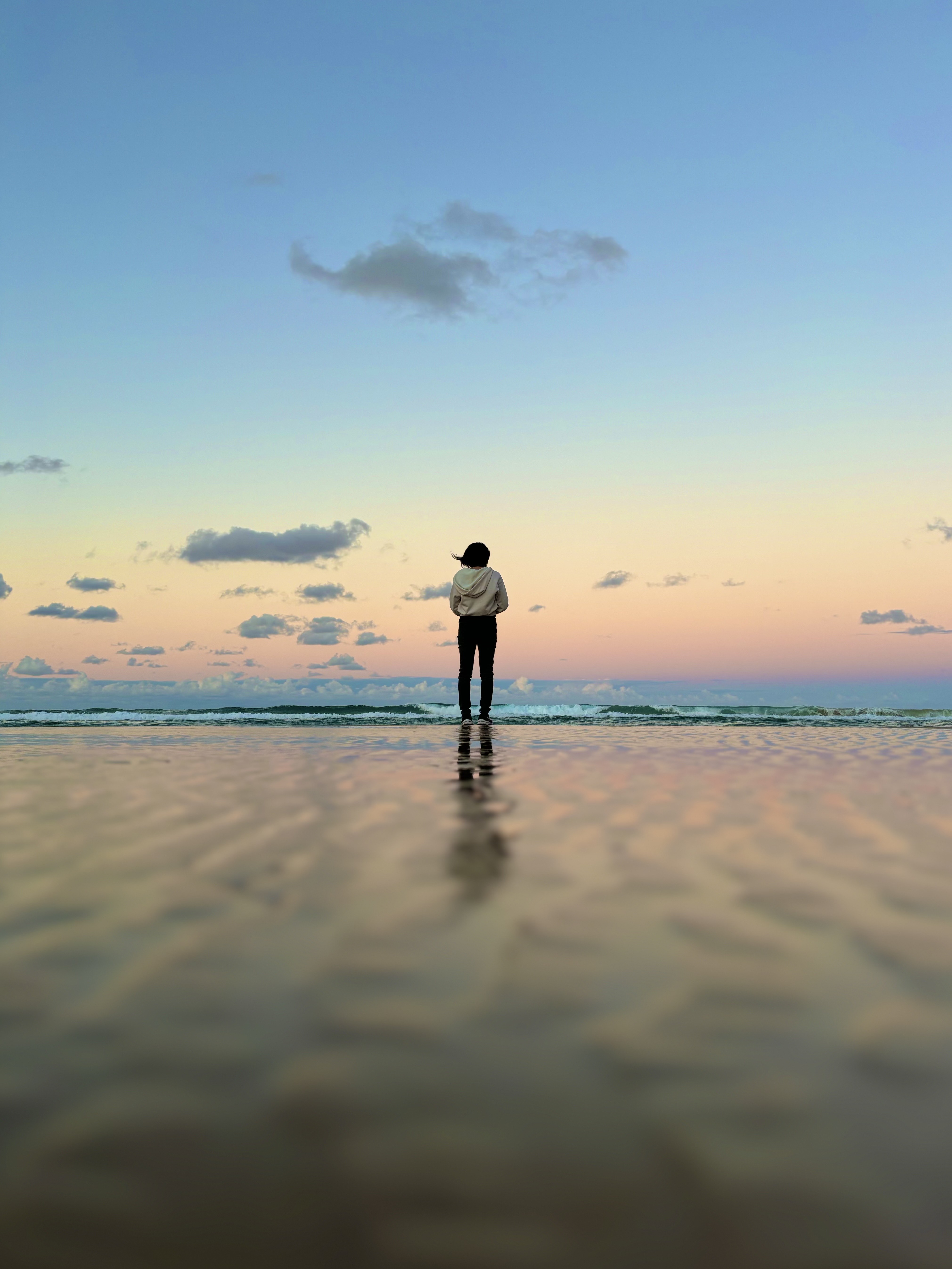 Bathed in the soft pastels of dusk, the photograph titled “Solitary Shore” captures a lone figure standing at the edge of the ocean, framed by a sky gently fading into stillness. Taken by Josh Chia Renjie (4.16), the image’s minimalist composition and reflective sands evoke quiet introspection, where solitude transforms into serenity.